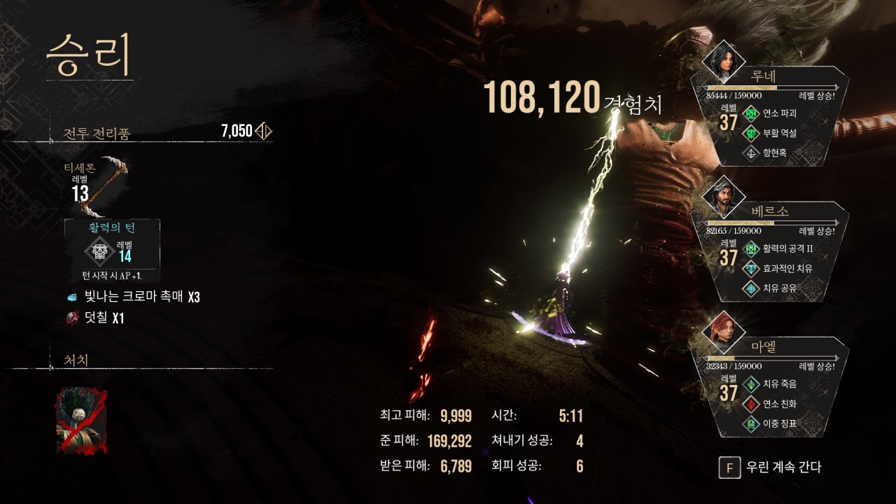 역시 어려웠는데 그래도 패턴이 아는 패턴이라 쉽…. 쉽진 않고 사자 나오면서는 진짜 어려웠네요. 그리고 여전히 추방 패턴 쓰는데 저택 앞 만큼 많이 안쓰는 건지 그냥 저때보다 딜이 좋아져서 덜 본 건지…. 또 루네는 추방되서 경험치도 못았다.