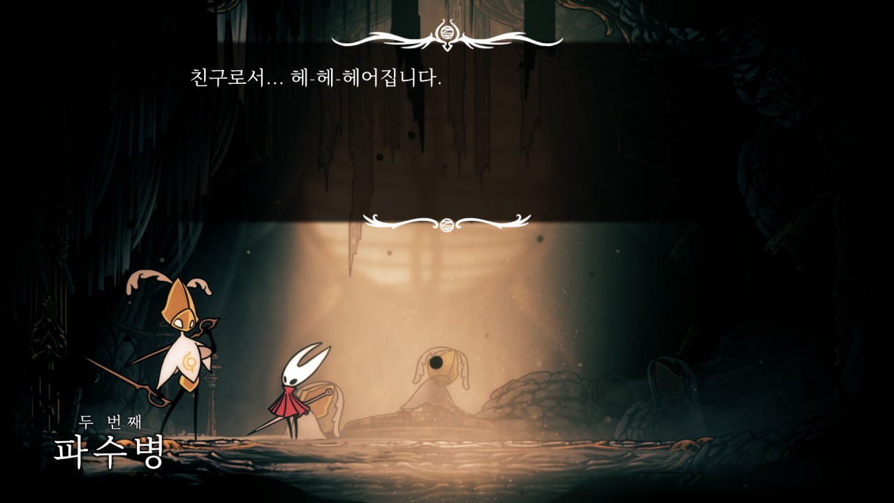 다르지만 뭐 이만하면 비슷하다 볼 수 있죠? 여튼 대화 내용을 보건데 역시 최종전은 심연에서 하는구나… 3장 진입 연출도 너무 좋았는데 할나 생각나서 좋았다. 과연 할로우 나이트 : 실크송이다.